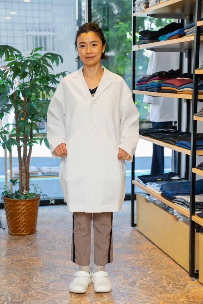 白衣は発売されたばかりのmyBigwife。コクーンシルエットが美しく、まさに繭のようなシボ感のある生地は高級感があり、モチベーションを上げてくれるのでは。ディスプレイをしているとお客様からの反応がよくあり、ユニセックスなので男女でご来店の方が一緒にご試着されたりと、他にはない形の白衣を楽しんでくださっています。